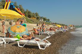 в 50-150 м от корпусов, мелко-галечный, 2 уровня благоустроенных теневых зон, оборудованных деревянными топчанами и пластиковыми лежаками, раздевалки, душ, туалет, бары; возможен прокат различных плавсредств.