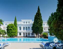 в пгт.Симеиз в живописной Лименской долине. Гостиница покорит Вас гармонией архитектурно-паркового ансамбля минувшей эпохи с редкой красотой природного ландшафта: реликтовой можжевеловой рощей, причудливыми очертаниями залива, лесистой горой Кошкой с горбатой вершиной, крутыми в утесах склонами и скальными отрогами.